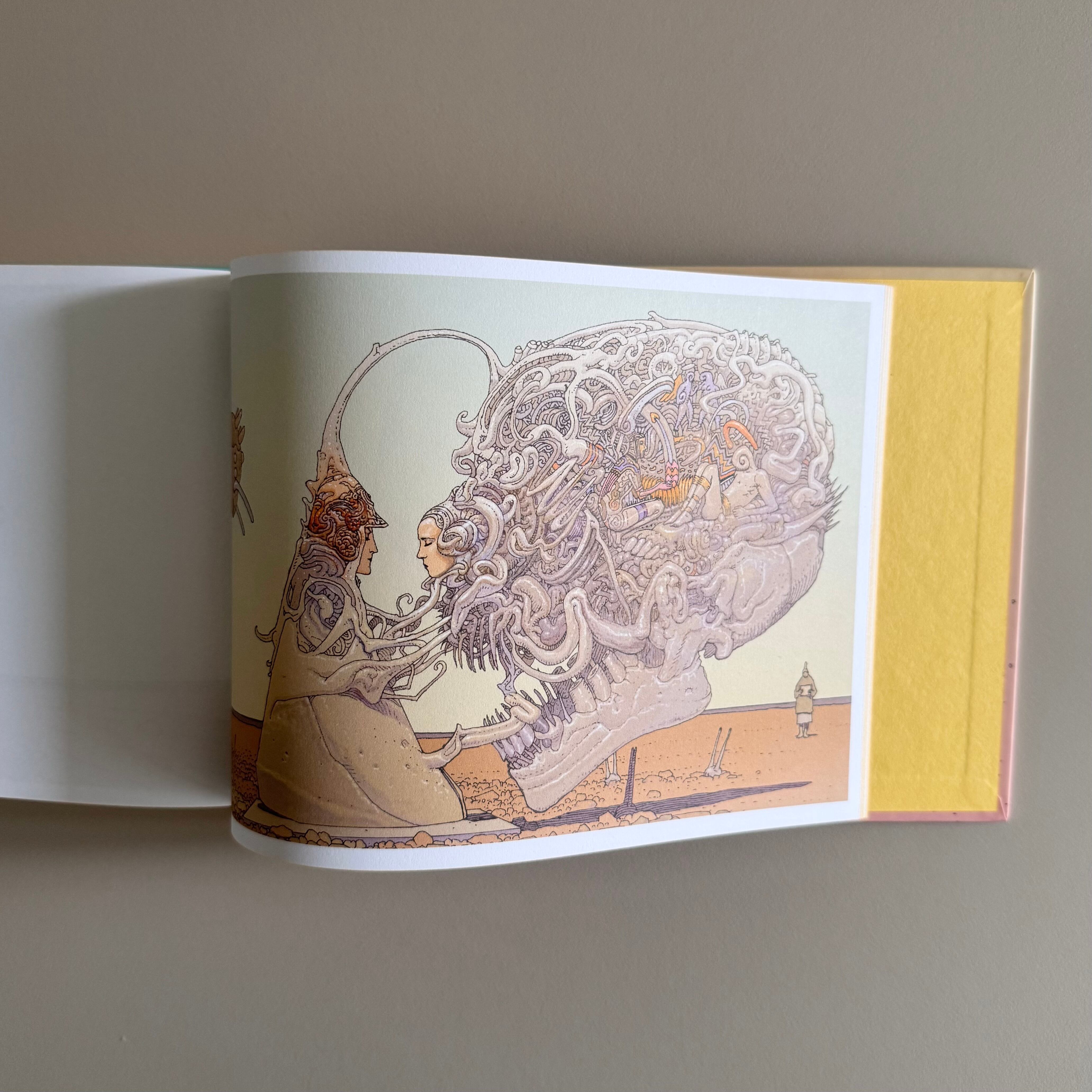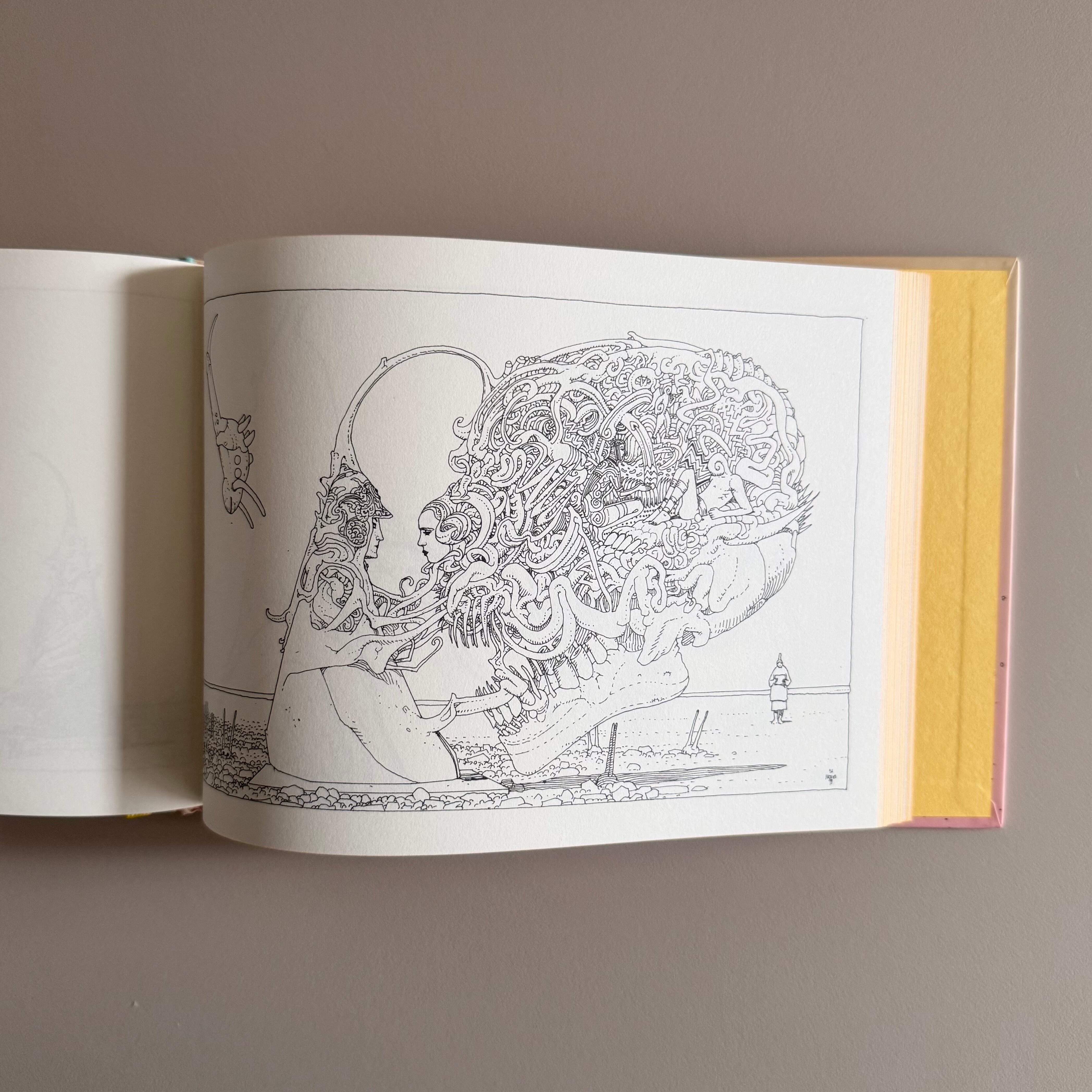 大友克洋さんや宮崎駿さん、鳥山明さんなど挙げだしたらキリがない漫画や表現の世界に衝撃を与えた作家メビウスさんの文字無しサイレントコミックですね。この内容も結構実験的で全ての絵をオリジナル書き下ろしでやるために1ページずつ思いつきで書き直し一切なしで続けていく前衛的な作品です。全ての絵が下絵も修正も無しと思ってみるともう衝撃ですよこれ。職人よりも上というか、もう巧みすぎて崇めたくなるような絵ですよね。この細かさがある、決して線が少ないわけではないんですけど、なぜか「ミニマル」な印象を感じる何かが宿ったような絵だなと思うんですよ。どこにでも売ってるペンと紙だけでここまで人を感動さしてしまうとなれば本当に羨ましい才能と驚くべき努力量なんだろうなと察することができますね。